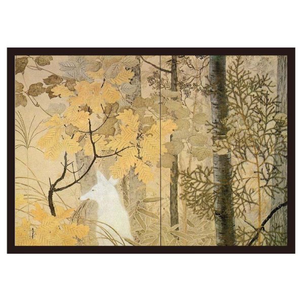 下村観山の『白狐 右隻』は、日本の伝説や神話を感じさせる幻想的な作品。和室や神秘的な雰囲気を演出する空間に最適なインテリアアートです。