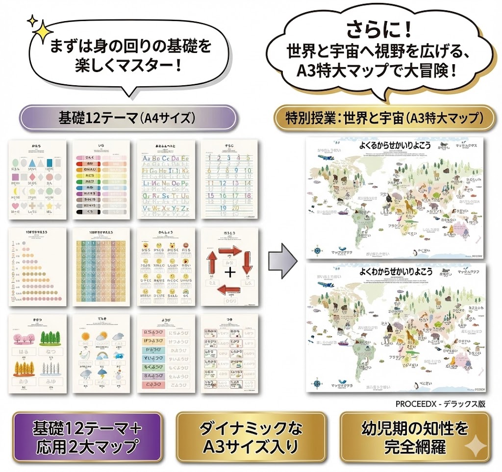 proceedxおうちでモンテッソーリ:12ヶ月の知能成長プログラム+地図+宇宙(14枚セット)|書いて消せる・プロが計算し尽くした「一生モノ」の知育教材ポスター