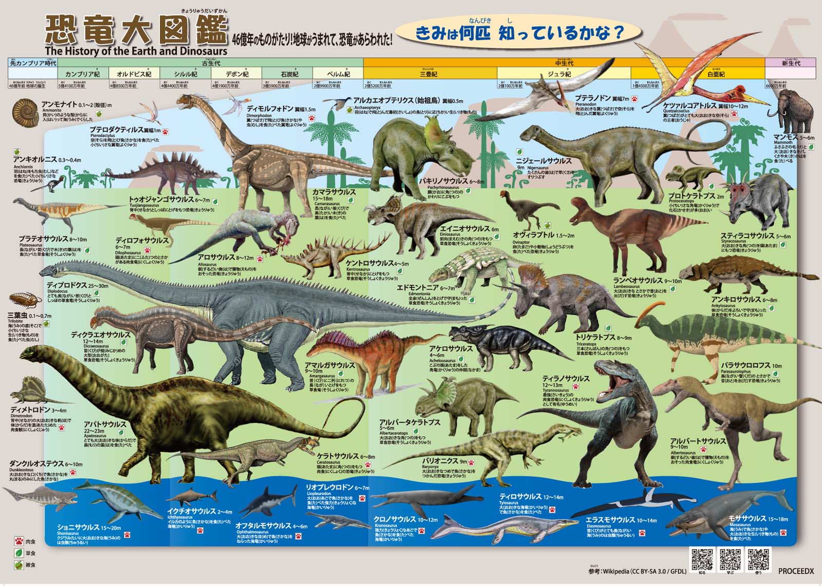 ・恐竜の世界図鑑ポスター/三畳紀?ジュラ紀?白亜紀の恐竜を精密なイラストでわかりやすく紹介。カナつきで読みやすく、恐竜博士気分に!