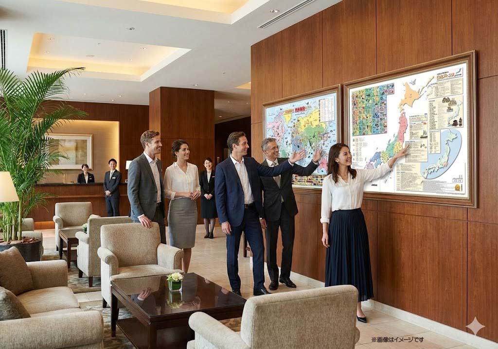 日本を訪れるゲストとの会話を広げる「日本地図」と、世界中から集まるゲストの出身地をマッピングできる「世界地図」。インバウンド対応の宿泊施設や教育現場に最適な、実用的で美しい地図ポスターのセットです。