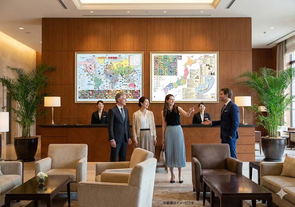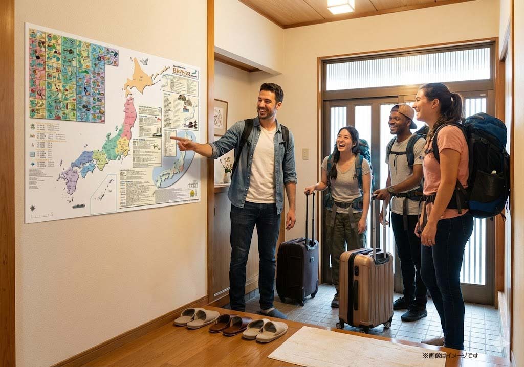 ? 【ゲストとの交流ツール】 「どこへ行きましたか?」とゲストに問いかけ、訪れた場所にシールを貼ったりメッセージを残してもらったりすることで、滞在の思い出を形にするコミュニケーションボードになります。