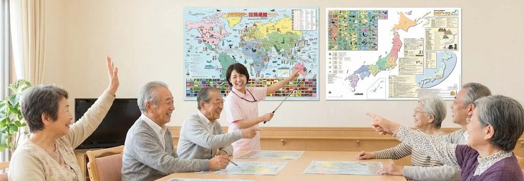 ? 「国内の思い出」から「世界への興味」へ: 日本地図で出身地を語り合った後、世界地図で「今、ニュースになっている国」や「お孫さんが住んでいる国」を確認する。点から面へと入居者様の関心を広げ、脳を多角的に刺激します。